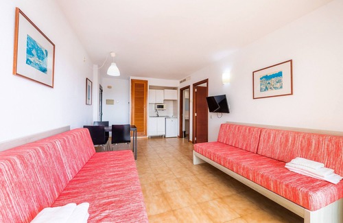 The holiday home "Apto con Terraza 201" is located in Cala Millor and is the ideal accommodation for a relaxing getaway. This property consists of a living room (with a sofa bed suitable for 2 children) a well-equipped kitchen, 1 bedroom, and 1 bathroom and can accommodate 2 adults and 2 children no older than 15 years old. Additional amenities include high-speed Wi-Fi (suitable for video calls) with a dedicated workspace for home office, a TV as well as air conditioning. A baby cot is also available.