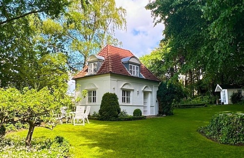 Romantic, detached holiday home, idyllic, Nordic blue / white furnished. 60 m to the Baltic Sea (beach Borby), on the edge of a small grove, large lawn (1000 sqm garden with gazebo), garden furniture. 1 km to the city center, 2 bicycles available.