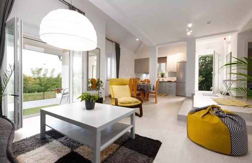 The detached holiday home is furnished in a modern and luxury style. The property is located in the town centre. Also due to the view over woods from the property and its quiet and sunny location the domicile is popular. Available for use: sunbathing lawn, sun lounger, barbecue facilities, terrace, garden furniture and courtyard.LocationRijeka. The holiday home is located on a enclosed garden plot. The landlord does not live in the house or on the property. Quiet surroundings, with green area and large garden. Parking is available on the property. Specialair conditioning.Facilities: internet access (WLAN). TV reception takes place via satellite. PoolAll pools are available for shared use. Outdoor pool. Dogsallowed, EUR 15.00/pet per day. DistancesShopping 500 m, restaurant 500 m, town center 500 m. airport in Omisalj 34 km. Rijeka: doctor, pharmacy, bank each 500 m. railway station 8 km. In summer: Bathing possibility 5,5 km in Rijeka (beach 5,5 km in Rijeka). DivisionHoliday home, 2 floors, 4 rooms (including 3 bedrooms), 130 sqm, in total 8 beds (including 2 additional beds). RoomThe entrance to your holiday home is located on the ground floor, is at ground level and leads directly into the vestibule. 3 bedrooms each with 1 double bed. Living room with 2 additional beds on double sofa bed. Kitchenette in the living room with dining area, electric stove, oven, dishwasher, fridge, coffee machine and toaster. Bathroom with shower and WC. Terms of lease and pricesIncluded in the priceair conditioning, parking place, electricity, gas, water, final cleaning, bed linen, hand towels, Wireless Internet access. Side costs-Additionally(Payable when booking)/registration fee obligatory 5 € per object per stay. additonal fee for short-term stays (less than 3 nights) obligatory 30% per booking per stay.Deposit:EUR 200,-/object.