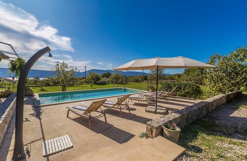 Holiday house in Linardići, island Krk for up to 8 persons. This holiday home has 4 bedrooms, 5 bathrooms, fully equipped two kitchens and living room, spacious outdoor area with pool. A beautiful garden with lawn and greenery offers a view of the sea and nature. The house is fully equipped and located in a peaceful location, yet only 10 minutes away from the bigger tourist cities and many attractions. The closest restaurant and supermarket are only 500 m away. WiFi, air conditioning, SAT-TV included in the rental price, a private parking spot is provided. The pool is open 15.04.-15.10.
