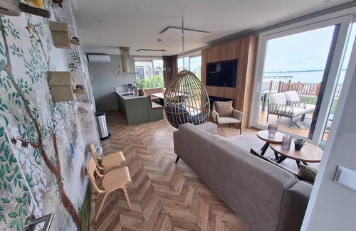 Outside, you can enjoy a spacious roof terrace with lounge chairs, a garden with a luxurious lounge set and sun beds, and a beautiful view over the water. There is even a wheelchair-friendly jetty present.