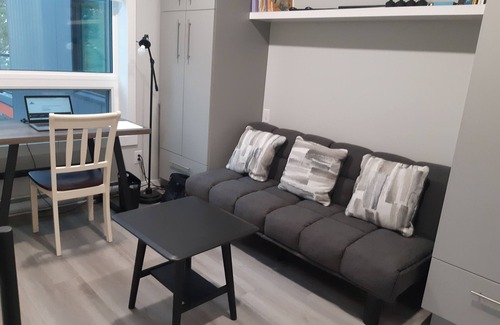 Appartment is owners personal part-time residence. Queen bed in master. Twin futon in office. Unlimited wi-fi. Reserved parking with electrical outlet.