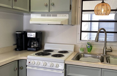 This bright and airy rental is fully furnished 2 bedroom/ 1 and a half bathroom with walk-in shower, full kitchen, living room, attached covered porch.There are two laundry locations in the park within 1 minute walking distance. Linens, towels, beach chairs are provided, gas grill/griddle for outdoor cooking. Cable and Internet included streaming TVs in living room and bedrooms. Located in friendly and well maintained 55 and older community centrally located near Malls, Beaches, Bike paths, and Dinning, Tenant must be at least 55 years old to rent.