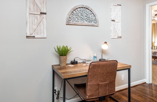The dining room is spacious and houses a large rustic dining table for you and your family to enjoy those home cooked meals you just prepared. Provided also is seating for the kiddos with a foldable high chair as well as a booster seat.