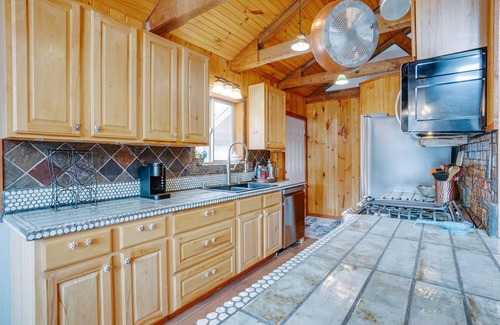 On the first floor, the living and dining areas are combined into an open-plan area. The living area features a wood-burning stove, a smart TV, and a sofa with dual chaise longues that seats four. There is also a sitting area for four that looks out onto a sweeping view of the Cougar trail and has access to a deck which is perfect for wildlife viewing. The dining area seats seven and opens into the kitchen, which is equipped with full-size appliances, including a dishwasher. From the kitchen, there is access to the fenced back yard and covered back porch.