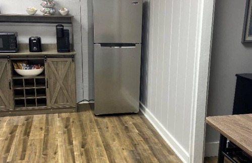 You will be close to everything when you stay at this centrally-located “home away from home”with private driveway and parking. The unit opens to a spacious living room area w/ a new queen sleeper sofa and linens, an additional second sectional couch and large tv for comfortable relaxation time. The unit has its own heating\air unit and WiFi designated for your use only. The kitchen area is equipped w/ a refrigerator/freezer stocked with water, a Keurig coffee maker with assorted complimentary coffee pods, creamers/sugars, disposable coffee cups, forks and spoons, a toaster and microwave. (sink, stove & dishes not available in the space) Small eating area with bar/table and two stools. The bathroom has a full shower/tub, towels, hair dryer and toiletries. The bedroom has a queen bed, dresser, lamps w/USB ports, desk w/chair which can be used as a vanity or work area. Small toys/games/coloring supplies provided. Access to a walking track and park. (#4 two 3 - six 5 zero - 0 zero 9 four)