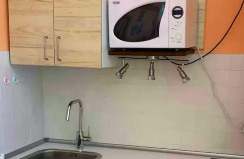 The interior is warm and functional. The living room has a comfortable sofa and a flat-screen TV for your relaxation time. The kitchen is fully equipped with a microwave, coffee maker, kettle, refrigerator, and all necessary utensils to prepare your meals.