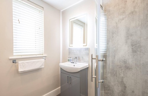 The bathroom features a walk-in shower, basin and a WC. Recently refurbished, it has a modern feel and silver finishings.