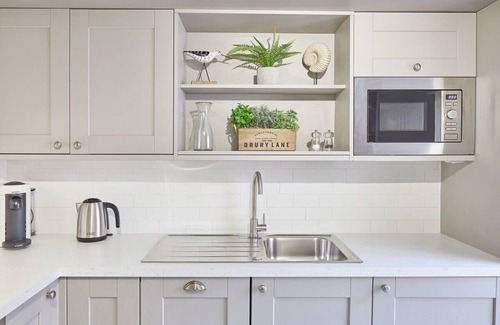 The cottage boasts an open plan kitchen diner at the rear of the property. Fully equipped, the shaker style kitchen boasts modern appliances and cookware so you can prepare home cooked meals during your stay. The dining area includes a wooden table and four traditional dining chairs.