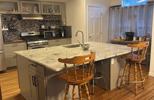 Upon entering the house you’ll step into the mud room, where you can find the washer and dryer immediately through, you enter into the kitchen which is generously stocked with everything you need to cook full meals! The kitchen flows openly to the bright and welcoming dining room where you can find a table with seating for 4, additional bar seating located at in the island, from the dining room you’ll enter the living room, which offers comfortable and spacious seating for the entire group to gather.