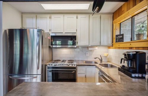 Relax nestled in the woods in a beautiful cabin by “Lake Cle Elum”. As you enter the cabin you’ll be greeted by a spacious, open-concept great room that opens up directly to 2 entertaining outdoor decks. The great room features a nest-like feel being perched on the hillside overlooking trees and the partial lake view. With 2 comfortable leather sofas, wood stove, and large 65” smart TV you will never want to leave! The kitchen is ready to provide you everything you will need for fantastic family dinners or feeding a large group (dishware, silverware, cooking utensils, pots & pans). It boasts a stainless-steel refrigerator & dishwasher with modern cement countertops.