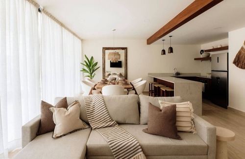 Step into effortless bohemian luxury. This ground floor 2 bedroom residence offers a spacious open concept layout, panoramic glass doors, leading to stunning private pool for the ultimate indoor/outdoor living experience. Designed with style and serenity in mind, the home is part of an exclusive complex featuring three resort style pools, a fully equipped gym, yoga, and co-work lounge. A perfect blend of elegance and comfort—just moments from Tulum’s pristine beaches and food scene.