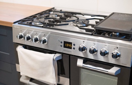 A bright and open-plan kitchen and dining area with space for 8 guests, complete with a modern dishwasher, and triple oven, with 8 gas rings.