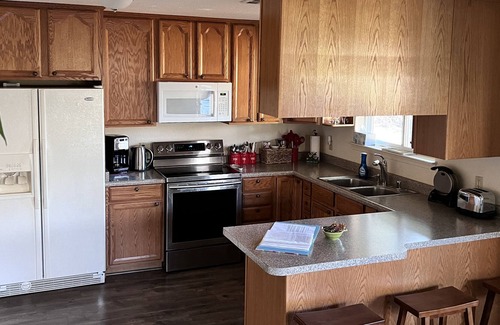 The 3BDRM/2BA house is fully appointed and includes a master bed/bath suite with a king bed and two additional roomy bedrooms with a queen bed in each. The kitchen is fully equipped and includes a waffle-maker, smoothie blender, coffee and tea makers, etc. Breakfast food and snacks are provided.