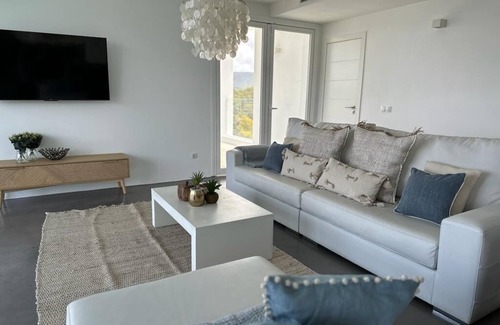 VILLA Yng - This 456 m2 modern minimalist style villa is located near Cala Moli, just a 5-minute drive from the beautiful beaches of Cala Tarida and Cala Vadella, 7 km from San José, and 20 km from the city of Ibiza. Enjoy splendid sea views, the S'Esparta and Bledas islets, and breathtaking sunsets.