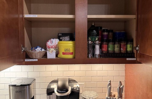 KITCHEN: The fully-equipped, granite & stainless steel kitchen has everything you need to prepare a delicious meal, including a complete set of hard-anodized cookware and both Keurig and drip coffee makers! We're fully stocked with plates, silverware, serving platters and basic cooking spices and oils to cook up a feast!