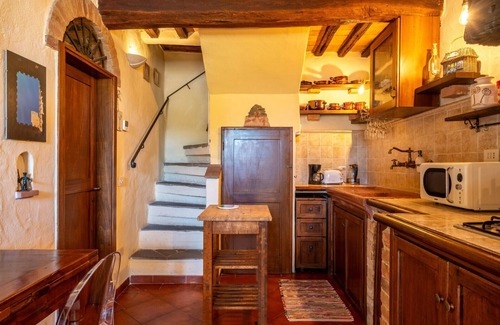 The accommodation has a cozy double bedroom, with a sofa bed and the option to add a single bed for children. The interiors, with exposed wooden beams and antique furniture, are decorated with unique pieces collected over time by the owners, from markets and travels, giving the house a special character. The fully equipped kitchen is the heart of the home, perfect for cooking together and experiencing the flavors of Tuscan cuisine in the warm atmosphere of a place full of life and love.