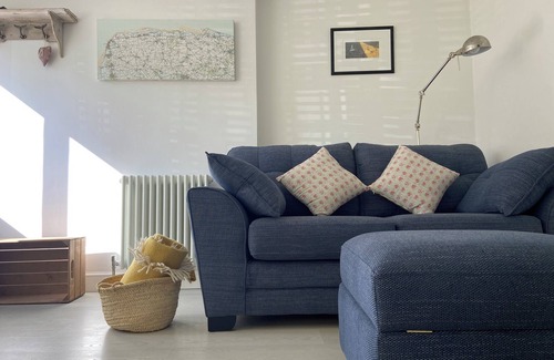 Sitting/Dining Room with dining table and chairs, beautifully comfy sofa with matching footrest for lounging, armchair, monk's bench, flat screen Smart TV, DVD, CD player, superfast WiFi, sound bar, clock radio with Blu-tooth speaker. I upgraded to superfast WiFi to make Sea Pink ideal for your workation. I work at the dining table sitting at the monk's bench. The new comfy sofa is a sofa bed. If you think you'll need to use it as a bed I can add the cost of another set of linen to your stay.
