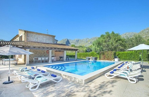 Finca Ignacio is an impressive 6-bedroom farmhouse with a large private pool and a beautiful mountain backdrop. Set in the idyllic countryside at the foothills of the Tramuntana region and ideally positioned just a 5-minute drive to the desirable resort of Cala San Vicente with a good choice of restaurants and beaches with crystal clear waters. Distributed over two floors the interiors are full of character and charm and comprise a lounge, dining area which are traditional in style and a modern fully equipped kitchen which flow into one another creating a large and airy living space. A double bedroom (air-conditioned) with an en-suite bathroom and an external utility area with a toilet complete the ground floor. On the upper floor, there are five bedrooms, one double and four twins and three shared bathrooms. From the upper hallway, you have access out to a small terrace where you can enjoy the fabulous mountain views. Outside, the house offers spacious grounds and terraces with a gated driveway to a parking forecourt and a fenced garden with mature trees, plants and hedgerows. There is a large private pool, a sun terrace with loungers, a brick-built barbecue area and a covered terrace overlooking the pool with games and dining furniture. Finca Ignacio is ideal for families/friends seeking a peaceful holiday retreat in a picturesque, unspoiled area of Mallorca whilst also providing easy access to restaurants, beaches and the larger resorts of Pollensa and Port de Pollensa.