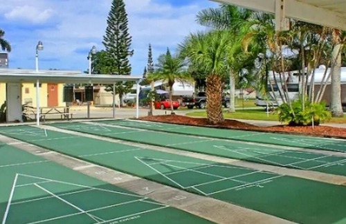 The resort offers heated pool hot tub and daily activity. Next to love boats famous icecream. Rv has heat and AC full kitchen, fridge and bathroom, shower and leather power sofa which recline patio outside sitting area. Quite time is 11pm great place to stay close to the beach for family that at looking to visit fort myers beach
