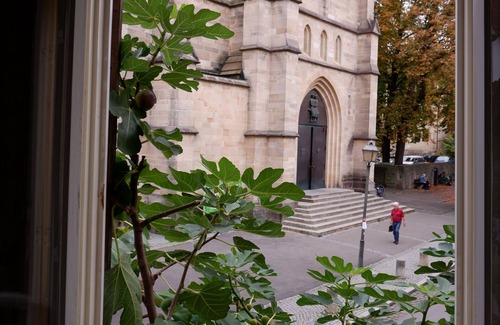 In the middle of the old town of Tübingen, and yet in a very quiet location, with a wonderfully sunny, open window facing south-east and a view of the Johanneskirche - you cannot live more individually in Tübingen! On the first floor of one of the oldest houses in Tübingen from the 14th century. there is a completely renovated 65 sqm apartment available, which offers everything you need for an unforgettable stay in Tübingen. You live directly in the traffic-calmed area of the old town of Tübingen, the market square with its historic town hall, the collegiate church at the Holzmarkt, the old botanical garden, the Neckar with a punting pier, everything is within walking distance in minutes. In front of the house there is a small patio where you can sit on a sunny day in the shade of a fig tree (!) can enjoy the view of the Johanneskirche and the hustle and bustle on the church square.