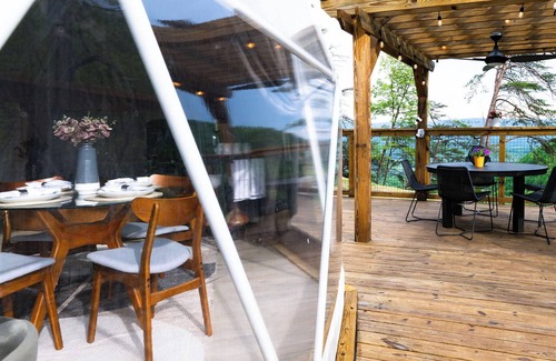 1 Queen Sized Bed, 1 Full Sized Bed in the Loft, 1 Queen Sofa Bed, 1 Small Size Refrigerator, Sleeps 4 to 6 and has its own incredible view. Our geodesic domes are equipped with kitchens, bathrooms, hot tubs, cozy beds.