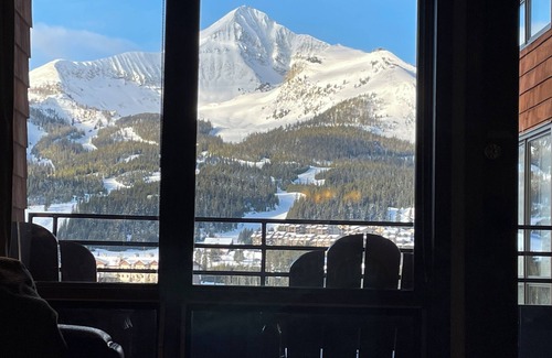 Best views of Lone Peak !!!! Less Than 1/2 mile to the main lifts!This two bedroom, two bath Condo has plenty of space to spread out in. Special features include a Private Indoor Hot Tub to soak your aches away. Extraordinary views of Lone Mountain Big Sky Ski Area resort can be enjoyed from the comfortable living room with a stone woodburning fireplace, from the balcony, as well as from the master suite and lovely sunroom.