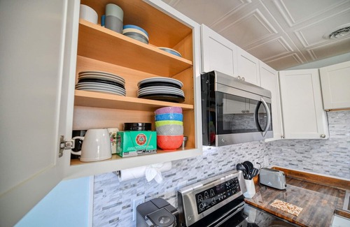 Kitchen: butcher block counters, tile backsplash, full size refrigerator, electric range, microwave, stainless sink with pull down sprayer faucet, fully equipped for making simple meals at home but please note there is not an automatic dishwasher in the unit.