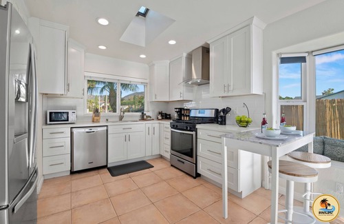 Step outside and you’ll find the real magic. The saltwater pool (yep, it can be heated to 82°!) is perfect for swimming year-round under the San Diego sun. Chill under the palm trees, grill up something tasty on the BBQ, or unwind after dark with the custom lighting setting the mood. The whole backyard is private and fenced—great for relaxing, entertaining, or letting the kids run around.