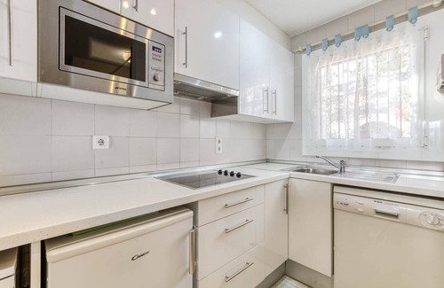 Open kitchen, 4 ceramic hob burners, oven, microwave, refrigerator, dishwasher, coffee maker, toaster and cabinets.