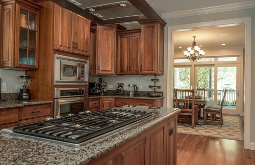 The home’s spacious interior is fit for a crowd, with enough room for everyone to spread out and find their own private corner while offering cozy common spaces to reconnect and entertain. In the early morning hours, take your freshly brewed cup of coffee into the sunroom and enjoy a moment’s peace surrounded in natural light while you plan out the day’s activities. Indoors, sink into plush leather sofa seating in the living room as you queue up all your favorite entertainment on the mounted smart TV, the fireplace keeping you toasty during those cooler months. You’ll be just a few steps away from the kitchen, a chef’s dream venue featuring stainless steel appliances, glossy stone countertops, and warm wood cabinetry stocked with cookware and dining ware. Pull up a high-top stool at the counter for casual fare or head into the formal dining room to gather at the table with seating for 8.