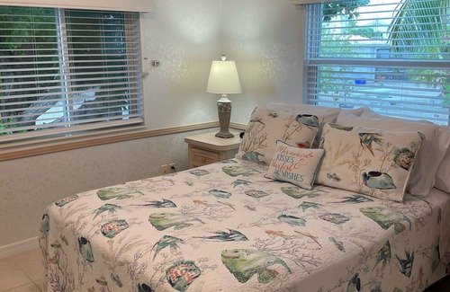 We have central air,1 bedroom, 1 bathroom with fully stocked kitchen, washer and dryer, dishwasher, toaster, keurig duo coffee maker and much more. Super clean and comfortable! We have a BBQ grill, and large common area in backyard with picnic tables and shade trees. We are not located on the water but our open water views are amazing! Bedroom has king bed and living area has a brand new queen size sleeper sofa featuring a comfortable gel memory foam mattress. There’s a TV in master bedroom as well as in the living room. WI-FI is located in the unit, you don’t have to go to the recreation center for your internet service. Bungalow will sleep 4. There’s a heated community pool, salt water swimming area, tiki huts on the beach, tennis courts, bocce ball, pickle ball, marina with 2 boat launching ramps at no additional charge, grocery store and many activities. This is a great vacation spot with 5 star restaurants 5 minutes away. Bahia Honda State Park is only minutes away with a beautiful beach. We have bicycles, and paddle boards. Looe Key offers an amazing reef and is close by. Lots of sandbars for your enjoyment. Key West is 20 miles away for lots of music, restaurants, beaches, Fort Zachary Taylor, shopping and much more. Lots of music and great restaurants close by. We are located in Venture Out Resort which is a great centralized location. Come join us in the Florida Keys for great fishing, spear fishing, diving, snorkeling hanging at the beach or just hanging out at this amazing resort! This is the perfect vacation spot!