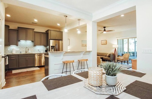 Enjoy the spacious and open concept living downstairs with a dining table for 6, huge kitchen fully stocked with appliances to make you feel right at home (including keurig, coffee maker, crockpot, ninja blender, pots and pans, and more). The living room can seat the whole family for a movie night, or enjoy a quiet evening looking up at the stars on the covered back patio. Gas grill available for use as well!