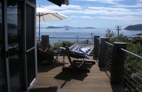 Island View is a quality holiday home of simplicity & contemporary coziness. You will be able to enjoy white beaches (300m away) turquoise water, bush walks, organic garden produce, quality bedding, darkness and silence apart from frog sounds and bird chattering ... enquire about the 7 Nights Winter Special to enjoy underfloor heating in the bathrooms, reverse cycle heating, electric blankets and a bottle of the finest local preservative free red wine by the fire.