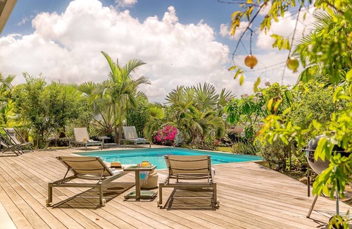 Welcome to Jade Palm.This charming villa, harmonious style will offer you 4 beautiful air-conditioned rooms including one, on the floor, with dressing. Two of them have their private bathrooms, the other two share the third bathroom.The American kitchen, fully equipped with washing machine and dryer, will offer you all the comfort you need to feel at home. The living room with TV and wifi opens directly onto the terrace of 41 m² which has a large table, a barbecue and a seating area. The swimming pool and sunbathing lends itself to delicious moments of relaxation. You will have the chance to bask in the hot sun of the West Indies while savoring the magnificent view of the surrounding countryside.For your convenience, Jade Palm is equipped with a free wi-fi, an alarm and a safe