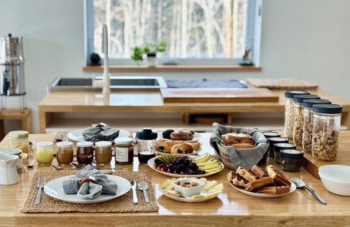 Guests can enjoy the infrared sauna, the 5-person outdoor saltwater hot tub, a forest path, children’s play area, and two cozy fire pits. Two wood-fired pizza ovens and a covered BBQ are available year-round.