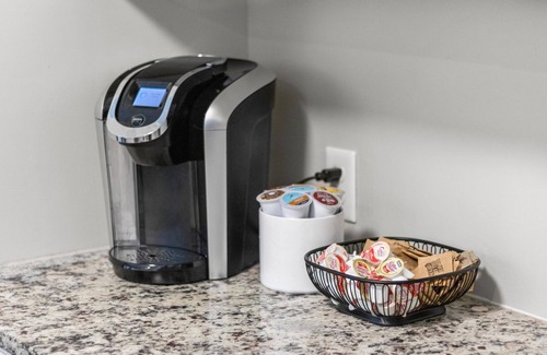 A variety of K-cups, creamer, and sugar are included with every stay.
