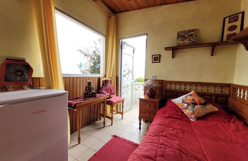 8,000 square meters of paradise! We are situated in a stunning, secluded location directly on the cliffs in the fertile north of Tenerife, amidst subtropical vegetation. Our vast grounds are an ideal place, especially during these challenging times, to keep your distance and feel at home. An oasis of peace and tranquility with stunning panoramic views of both the endless expanse of the Atlantic and the fascinating mountain world of Pico del Teide. A large seminar room is available for yoga, meditation, dance, music, and events.