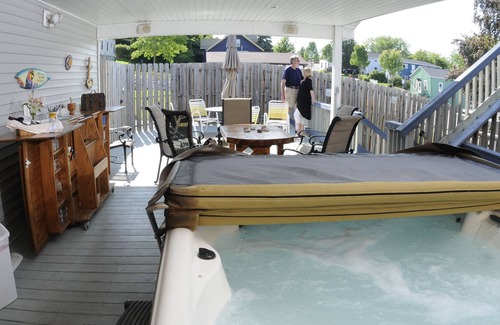 The hospitality extends to a large attached deck that is accessible from ground and first floors. The deck consists of a ( 4 person ) hot tub, wet bar with outdoor refrigerator, and outdoor dining set perfect for enjoying the evening as the sun sets.