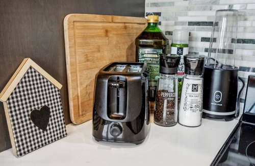 The kitchen area has numerous cooking appliances. If you want to take a break from restaurants, then this is the place for you.