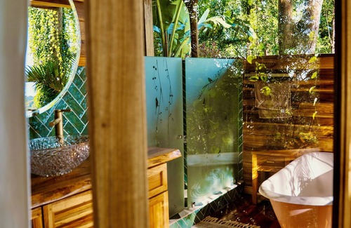 The crown jewel of this haven is the open-air shower and bathtub, a luxurious oasis where you can bathe among the tree tops. As you soak, the stunning vistas of Cahuita National Park and the shimmering Caribbean Sea unfold before you, creating a serene escape that feels truly magical.