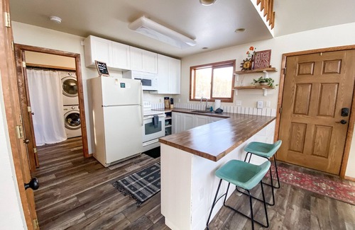The home has 2 bedrooms and one bath. The master bedroom has a king size bed and the second bedroom has a Queen Bed with a set of bunk beds.. There is a bath with a shower/tub combo. The bath also has a washer and a dryer. There are two family rooms. The upstairs has two comfortable sofas and a television with satellite programming as well as a DVD player, so bring along your favorite movies. The main floor has a cozy wood stove that adds to the charm of the home and seating area to relax and chat. The floor to ceiling windows give you a fantastic view of the mountains.. The kitchen is well equipped with all dishes, utensils, and pots and pans. You will have everything you need. There is a dining table for 6 and extra room at the counter if needed.