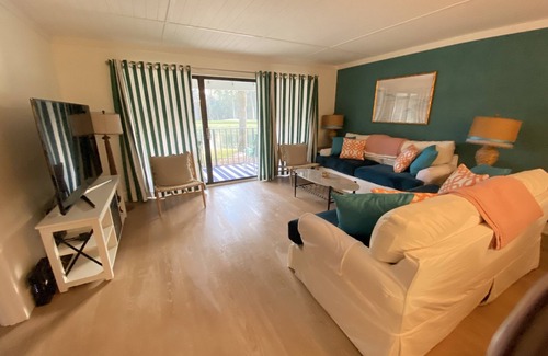 This fully renovated 3 bed, 3 bath Edgewater golf villa (in the 800 building) is child- and family-friendly and specially designed with your experience in mind. Brand new kitchen appliances, tiled showers, large Samsung TVs, plenty of comfortable seating and a great patio. This ground floor Edgewater golf villa sleeps 10 (maximum of 8 adults) in three bedrooms, each with its own bathroom. The main bedroom has a king bed, the middle bedroom has 4 twin beds (2 bunk beds), and the front bedroom has a king bed. Two full sized sofas in the living room provide plenty of comfortable seating. Four Polywood Adirondack rocking chairs provide great outdoor seating with views to the golf course and beyond. Lily Pond is located on the executive golf course, facing the Gulf of Mexico (across the street), with a heated pool right in its backyard. Tennis/pickle ball courts and conference center are a quick walk. Edgewater’s Lagoon Pool and beach are a short walk or tram ride over the bridge. The Lagoon Pool features a kids play area, hot tubs, Oceans restaurant and Shakers beach bar, and the sugar white sandy Gulf of Mexico beach. Very convenient parking just outside the front door (two parking passes included; a third is $50 extra.) Please note: NO sofa bed; maximum occupancy is 8 adults, 10 people total. NO smoking inside. NO pets. Any evidence of pets will result in loss of full damage deposit. Right next door is Lily Pond’s sister property, Lily Pad (VRBO#2529335), a ground floor villa with 2 bedrooms (one with king bed, one with two queen beds), both with attached bathrooms and the same renovation and decor. Lily Pond and Lily Pad’s ground floor patios are right each beside each other, perfect for family gatherings. We also have a newly-renovated 2 bedroom, 2 bathroom beachfront condo at Boardwalk Beach Resort (VRBO#3127174.) This is a special, unique rental property that we are happy to share with families looking for updated, comfortable and stylish accommodations.