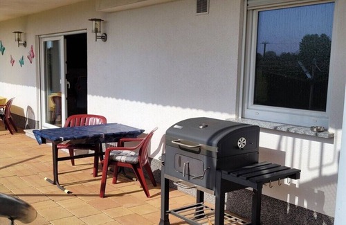 We offer accommodation in a 76 sqm, very well-equipped apartment. Up to 4 adults can feel comfortable there. ___Bedroom with 2 single beds that can also be pushed together, bedside table, bedside lamps, alarm clock, wardrobe, chest of drawers, flat screen TV on the wall. (optionally a children's bed and/or a children's travel bed) ___Bathroom with bathtub, shower, toilet, sink, cupboards for storing your personal hygiene items, hair dryer, towel warmer, washing machine, clothes rack (optional: changing table attachment for the washing machine, baby bath, toilet ring, potty) ___A kitchen with dining area for three people, freezer, refrigerator, oven, extractor hood, microwave, kettle, toaster, filter coffee machine, Senseo, dishes, cutlery, mixer, baking tins, etc. up to a meat tenderizer. ___A large living-dining room fully furnished with a dining area for four people, two 2-seater sofas, coffee table, TV board, flat screen TV, three display cabinets, desk with desk chair, a bed for a third person (optionally a bed for a fourth person can also be placed there) From there you can also access the terrace with a seating area, parasol, sun lounger, a swivel grill and a charcoal grill are available there