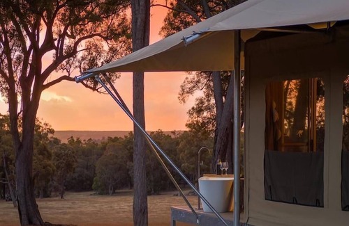 Nestled before Kaarta stands a proud, centuries-old giant Jarrah, guarded by a graceful court of grass trees. These timeless sentinels frame sunsets beyond compare, weaving an atmosphere of pure enchantment that will hold you spellbound.Privacy is your luxury. Each tent boasts breathtaking vistas, generously spaced for undisturbed tranquillity. Wander at will, lose yourself in the vastness of our sanctuary, and let wildflowers guide your journey. Serenity Gully whispers your name, ready to unveil the wonders of nature and weave an unforgettable escape into the heart of pristine beauty.