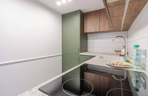 Katowice Luxury Two-Level Apartment features a stylishly decorated living room with a sofa bed and kitchenette, a bedroom on the upper level with a comfortable double bed, and a bathroom. Guests have access to a range of amenities, including free WiFi, a washing machine, an iron, a hairdryer, a refrigerator with freezer, a dishwasher, an oven, an induction hob, a kettle, and kitchenware. Public parking is available near the building, although parking spots are not guaranteed.
