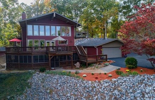 Come explore Lake Living at this Kentucky Lake Chalet. Email for Specials. This 3 bedroom, 3 bath lake chalet is nestled into the hillside overlooking Ky Lake. The chalet-style home boasts amazing views from almost every room of the home. If you're looking for a lake rental to entertain family, friends, or fishermen you're going to want to check out this lake-house as it's a crowd-pleaser. This home offers 2 acres with a private 30ft covered slip dock w/year-round water, jet-ski pads boat ramp & a 4 seater mule to carry you to & from the dock if needed. Enjoy the wrap-around decks for relaxing after a day on the lake or maybe a dip in the hot tub. Revel in the sun rising over the lake, view thousands of stars at night, play corn hole, and enjoy the fishing and boating this lake is famous for.