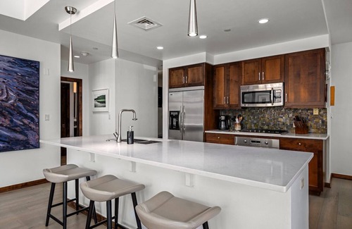 NEW to the rental market, Kestrel Corner is located in Howelsen Place, the ultimate in downtown comfort and luxury. The windows at Kestrel Corner face 7th Street AND Yampa Street giving our guests 180 degree views of the Steamboat ski area and historic Howelsen Hill. In September 2023 the entire condo received a facelift, new paint throughout, new carpeting, and new furnishings and linens in both bedrooms. A unique feature to the property, the original artwork you see in the pictures were painted by the owner, including several large pieces.