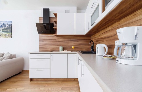 This fully equipped apartment is suitable for 4 people. It consists of a living room with a double convertible sofa and a bedroom with a double bed. The apartment also has a kitchenette equipped with the most necessary things to prepare a meal yourself, such as a microwave, dishwasher or coffee machine. There is also a bathroom with a shower. Multimedia include flat-screen SmartTV and free mobile Wi-Fi Internet access. Electric external blinds are installed on the bedroom and living room windows, allowing the rooms to be darkened at night. From the terrace, we can admire the beautiful view of the Tatra Mountains. From the terrace, you can admire the beautiful view of the Tatra Mountains. The terrace is equipped with a table and chairs.