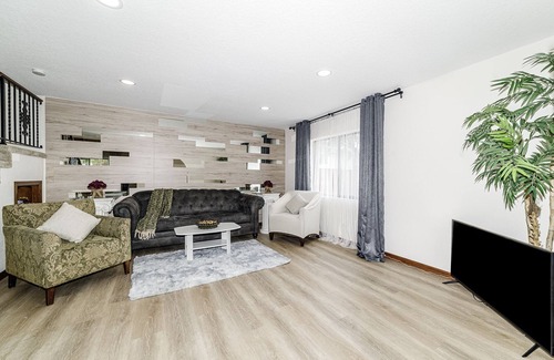 The living room offers a smart TV, couch, coffee table, and two armchairs for relaxation. The dining room includes a table with seating for six people. The open-concept kitchen showcases new stainless steel appliances and elegant granite countertops. The first floor features new vinyl flooring, while the second floor has new carpeting for a cozy feel. The steam cleaner and iron, patio chairs, and table are stored but can be requested.